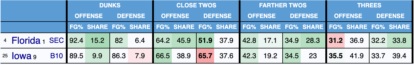 With the size Florida has down low, they are only allowing a 51.9% field goal percentage on shots at the rim. So that means Iowa is more than likely going to be forced into shooting a lot of threes in this game and if they are not falling it’s going to be a long night.