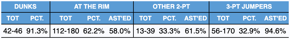 As you can see, he’s very good around the rim, but if you can push him outside of the paint and force him to shoot anything other than a layup, his field goal percentage goes way down.