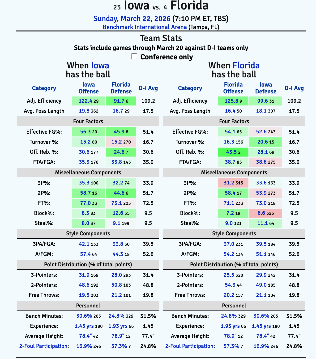 Florida also loves to get out an run because they are playing at the 29th fastest tempo in the country, while Iowa plays at fourth slowest pace in the nation.